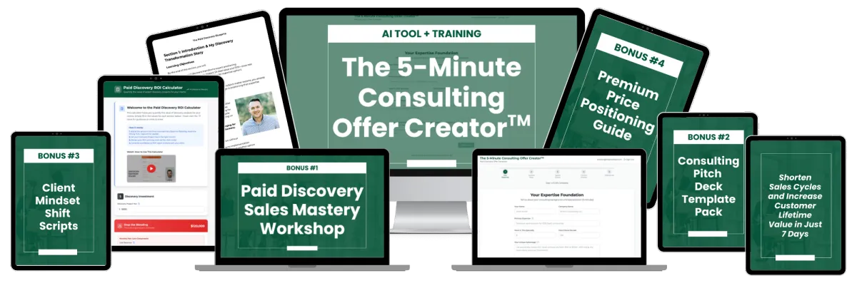 The 5-Minute Consulting Offer Creator™ customizes everything to your specific expertise area, and the Paid Discovery ROI Calculator adapts to any industry's typical cost structures and pain points.